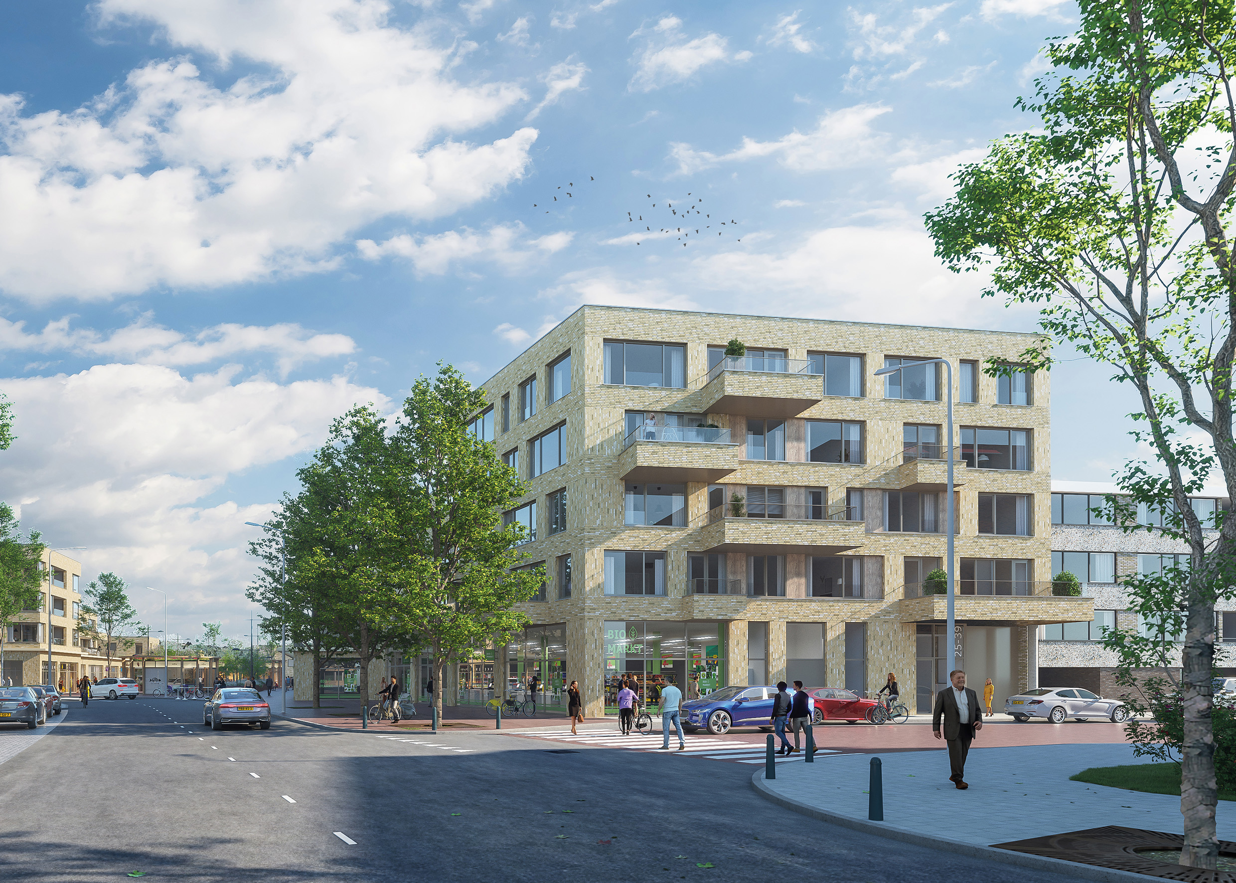 Impressie van het nieuwe woon-winkelgebouw op de kop van het Willem Royaardsplein